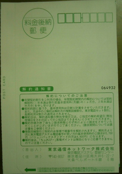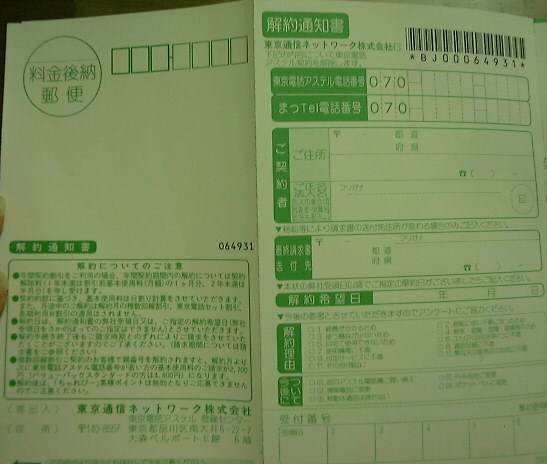 左がK−Opti.(関西)、右がTT−Net(関東)である。共に往復はがきを使うことで用紙・郵送料共にコスト削減に励んでいる(ちなみにツーセルは封書)。この段階ではフォーマットといい、注意書きといいウリ二つである。