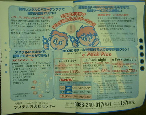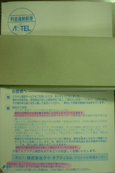 しかし、K-Opti.は「ご存知ですか? アステルのこんなサービス!!」と裏面にPAレンタル、機種変更優待施策や年刑付加によるe-P@ckプランなどやんわりと解約引き止めの広告をきっちり入れていた。さすがは関西人、という言うべきか。